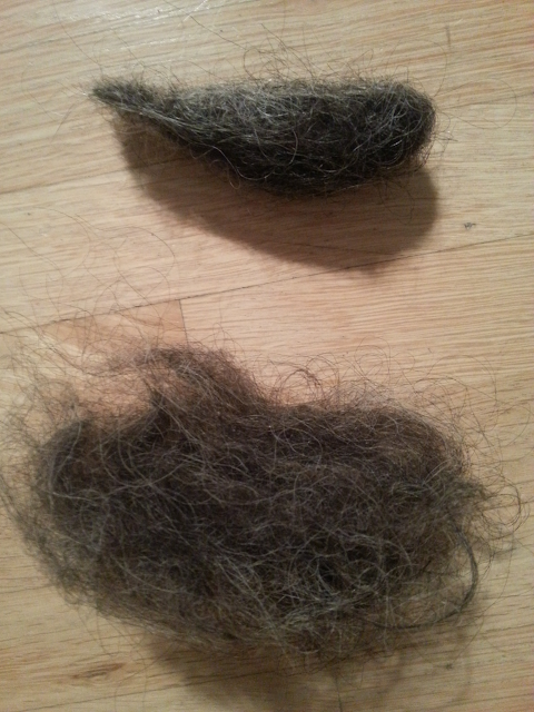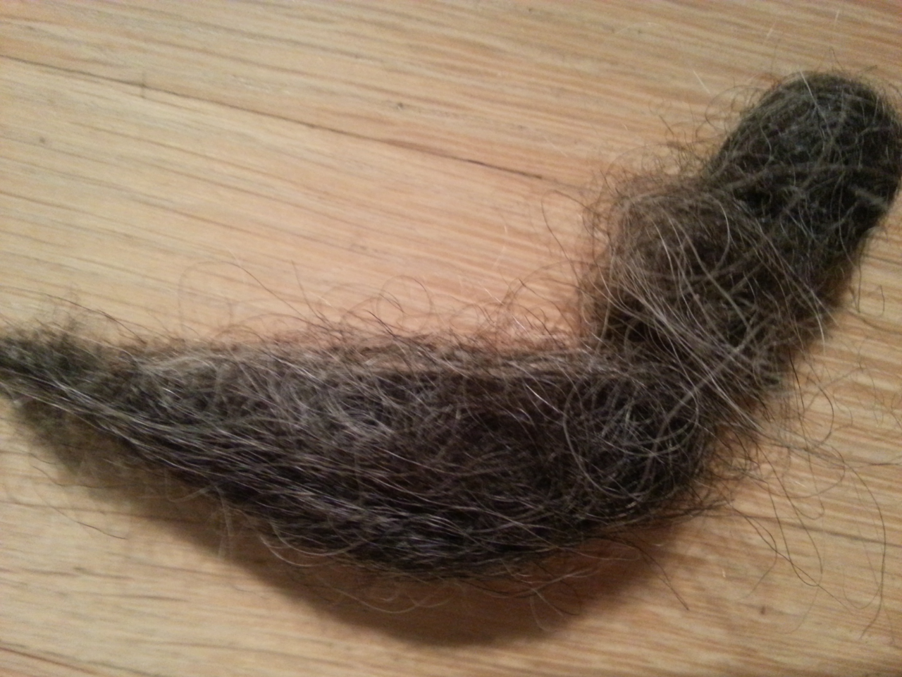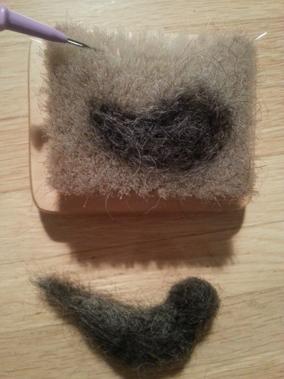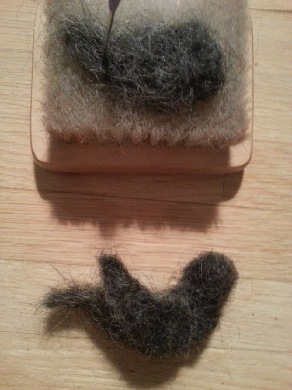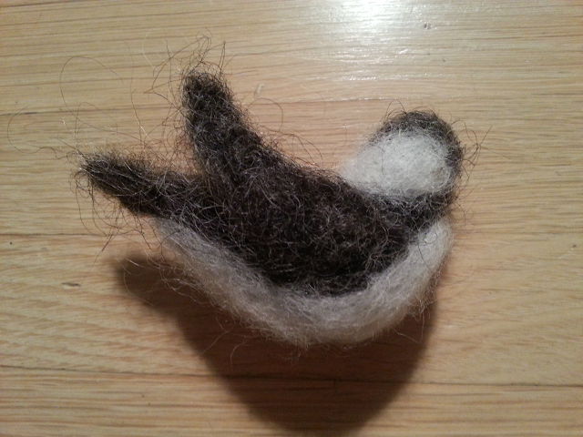 Start with some grey roving – you’ll need less than 1/4 ounce. Form the roving (bottom) into a shape similar to a bird’s body and needle punch it into the body (top). Once you have the main structure, you can add more roving to plump up the bird.