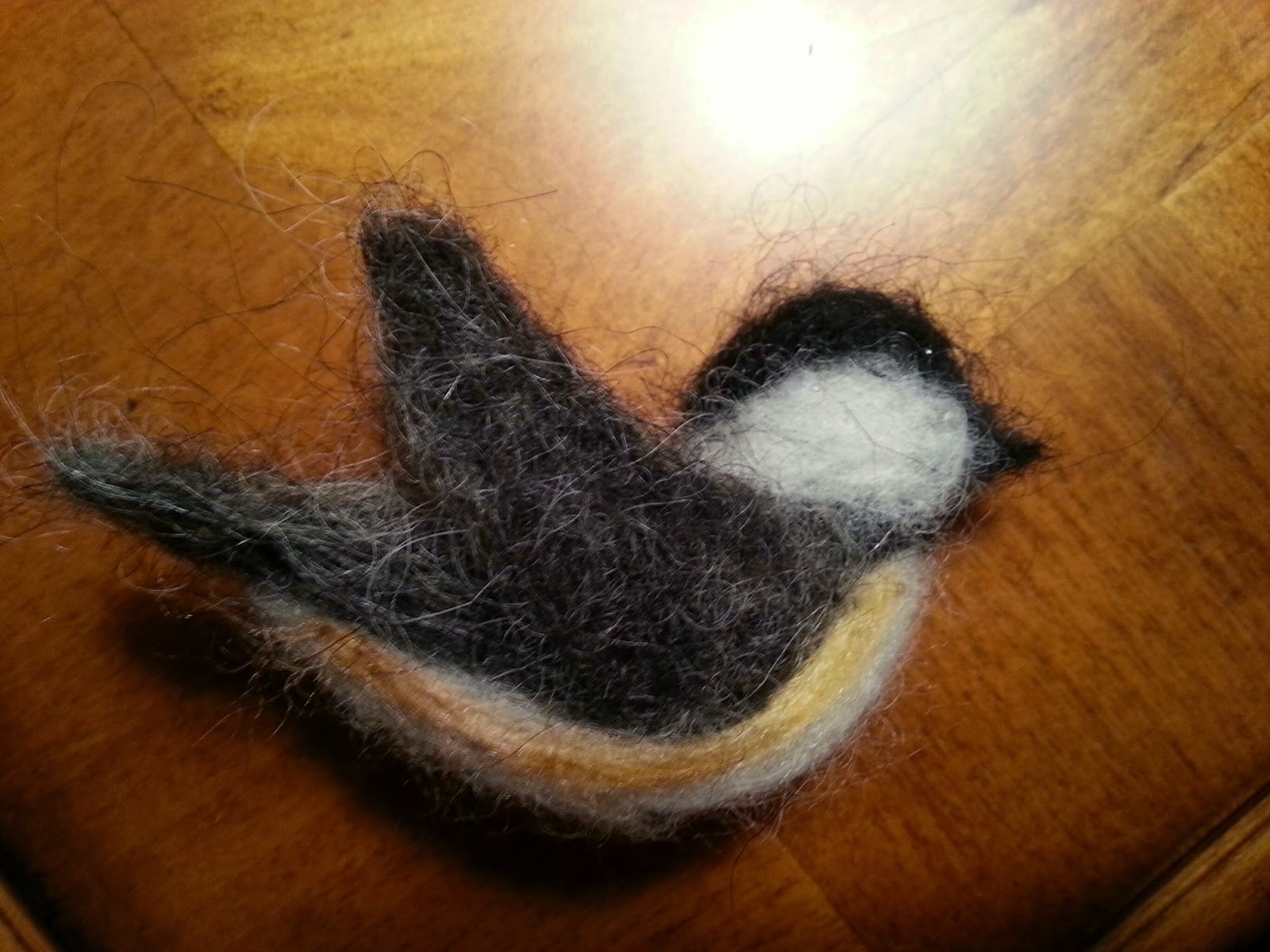 Next, I take a very small amount of roving and try to felt the beak the best I can, leaving loose fibers to attach to the face of the bird. Additionally, I put the black cap on the chickadee.