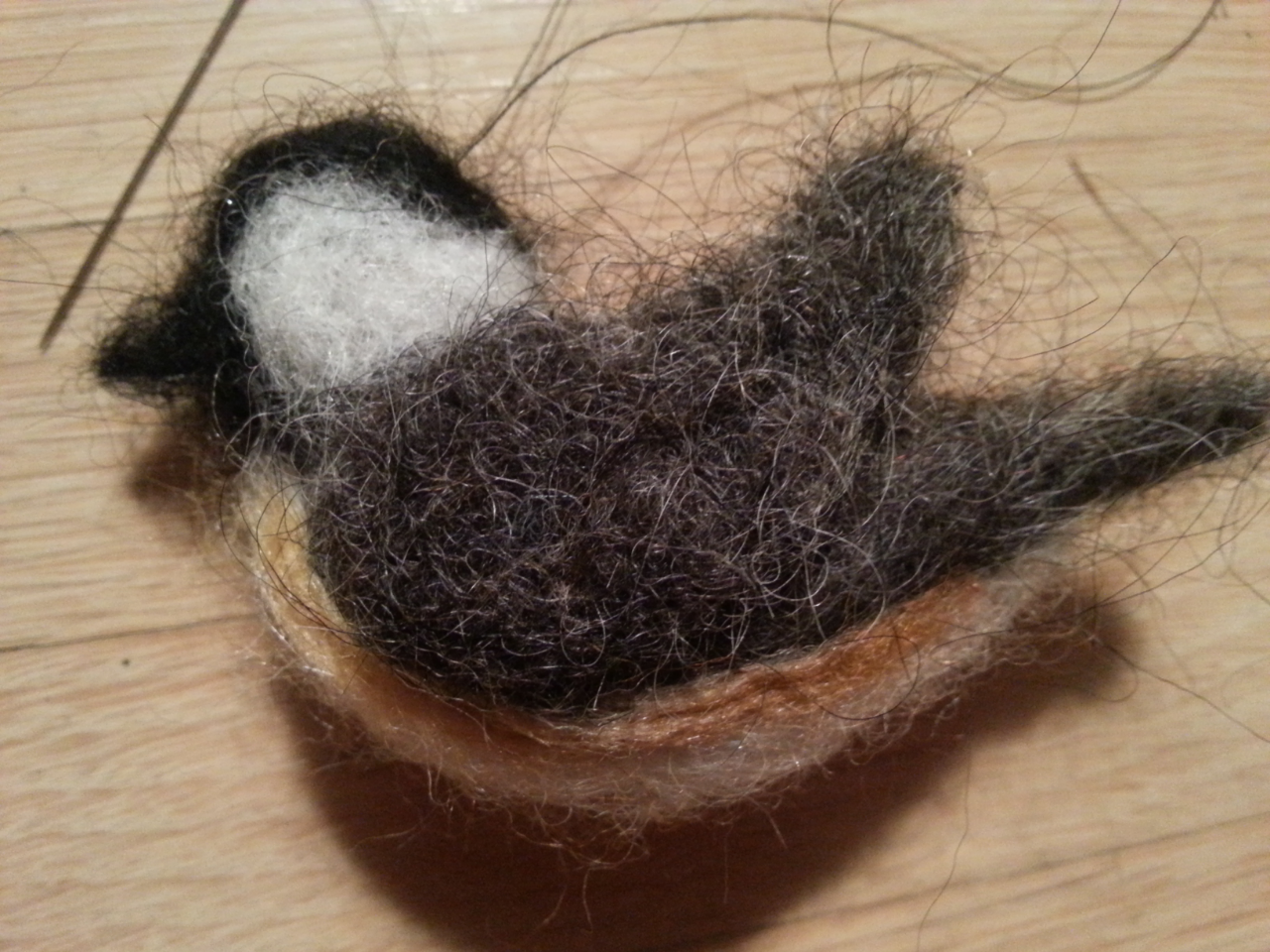 So you’ll note that the bird is all one color until now. I felted white to the birds breast and also to the face of the bird. I look at a bird book and use those photos to determine the coloring of the bird.